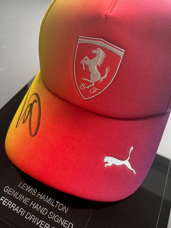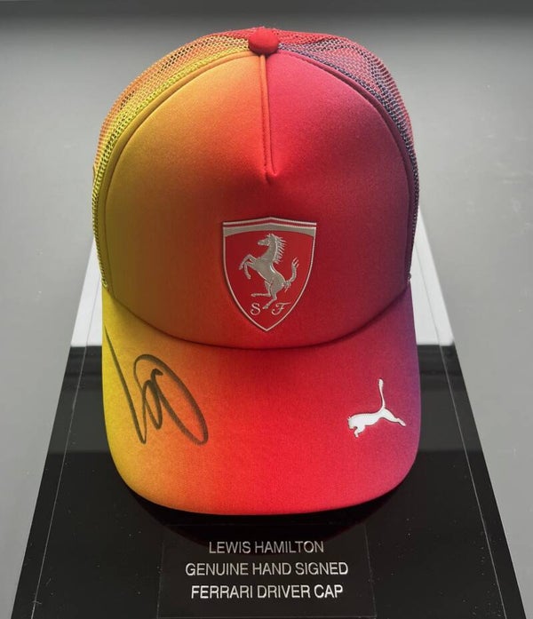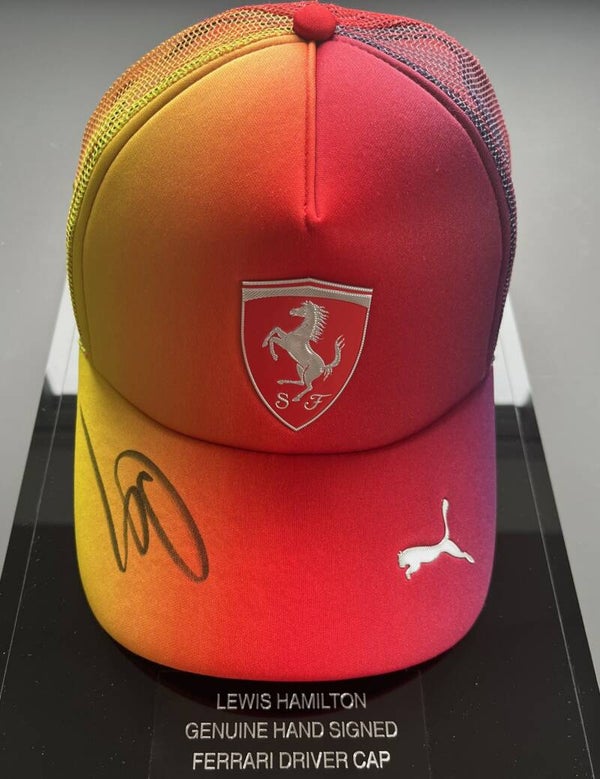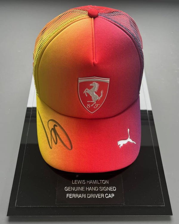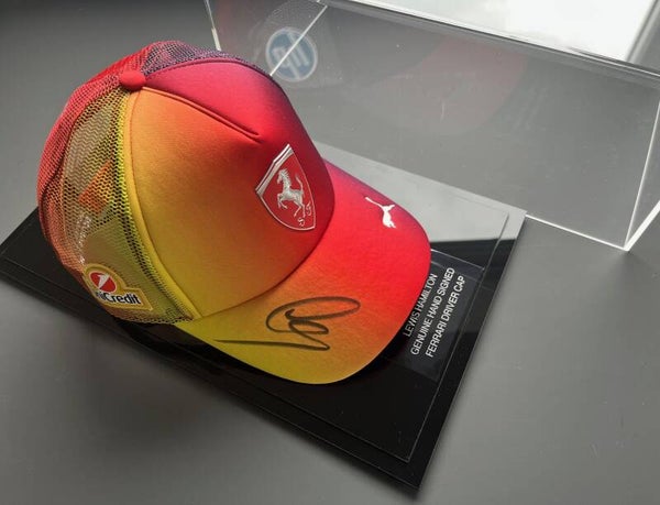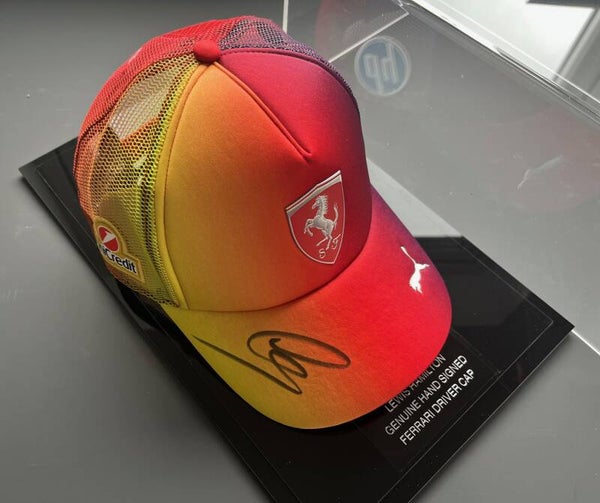 LEWIS HAMILTON SIGNED - FERRARI ISSUE DRIVER CAP - NOT FOR SALE - SUPERIOR QUALITY - DISPLAY CASE - ENGRAVED PLAQUE - UNIQUE OPPORTUNITY