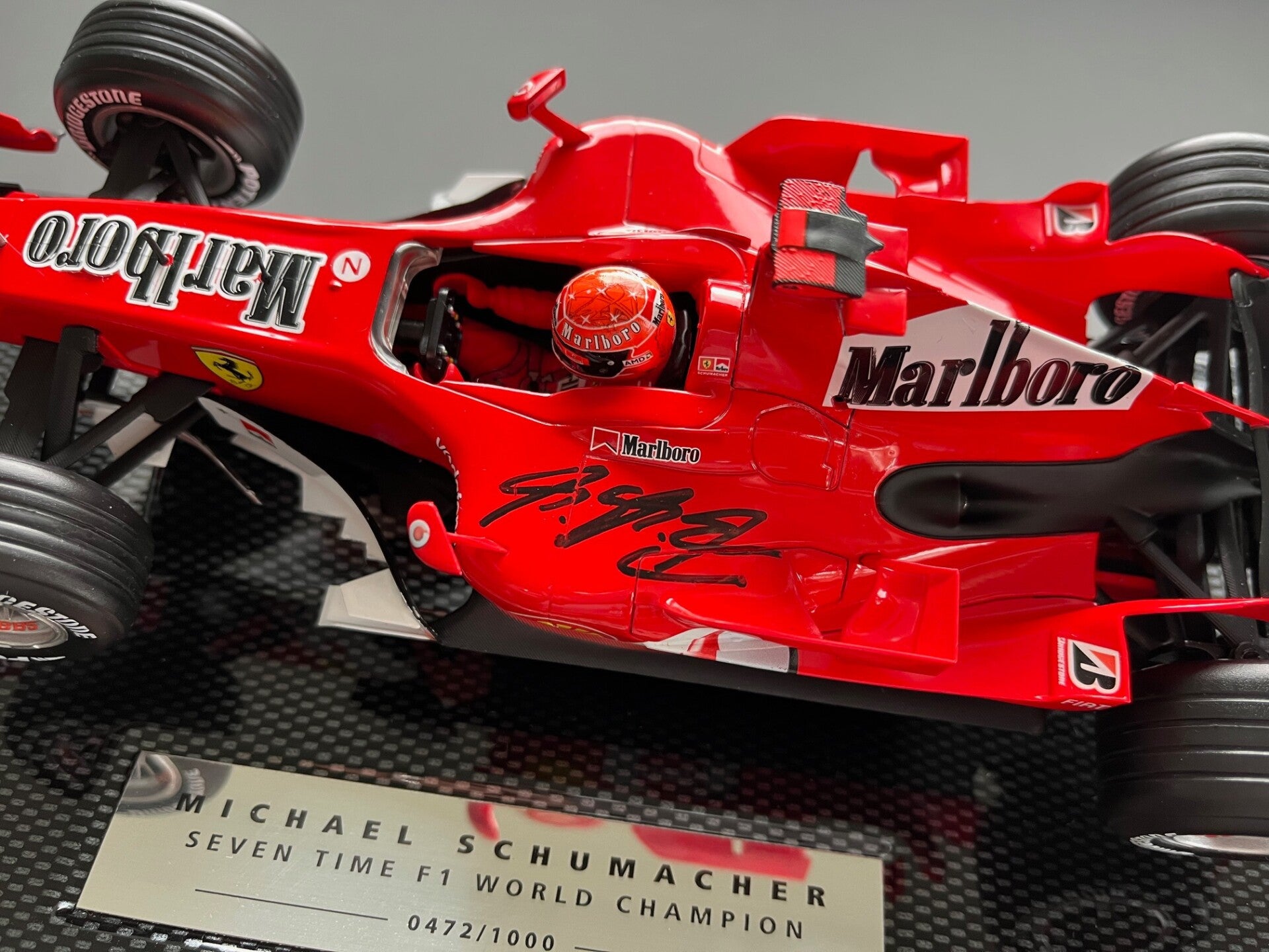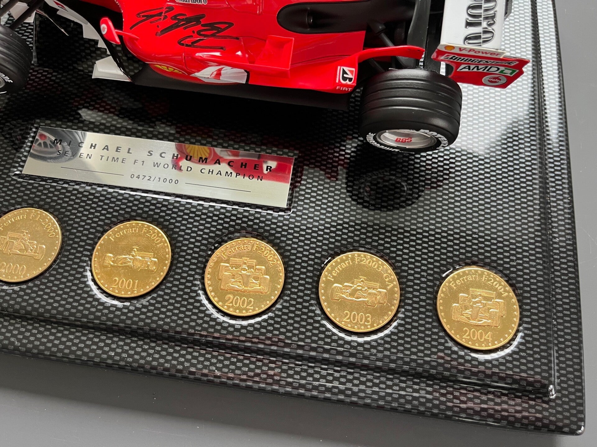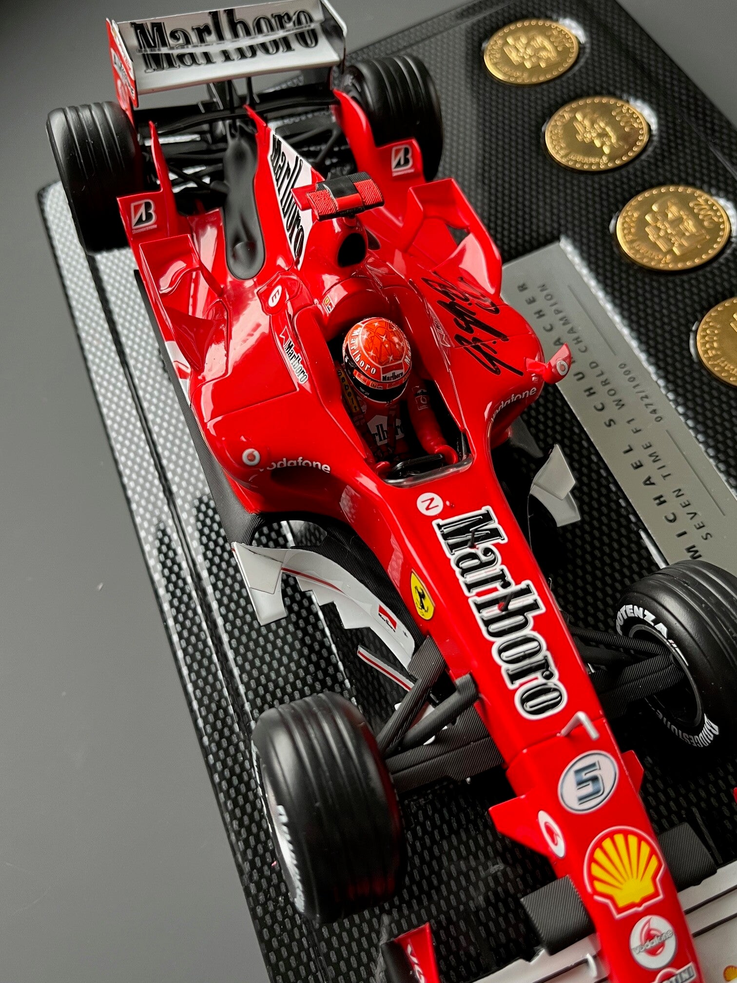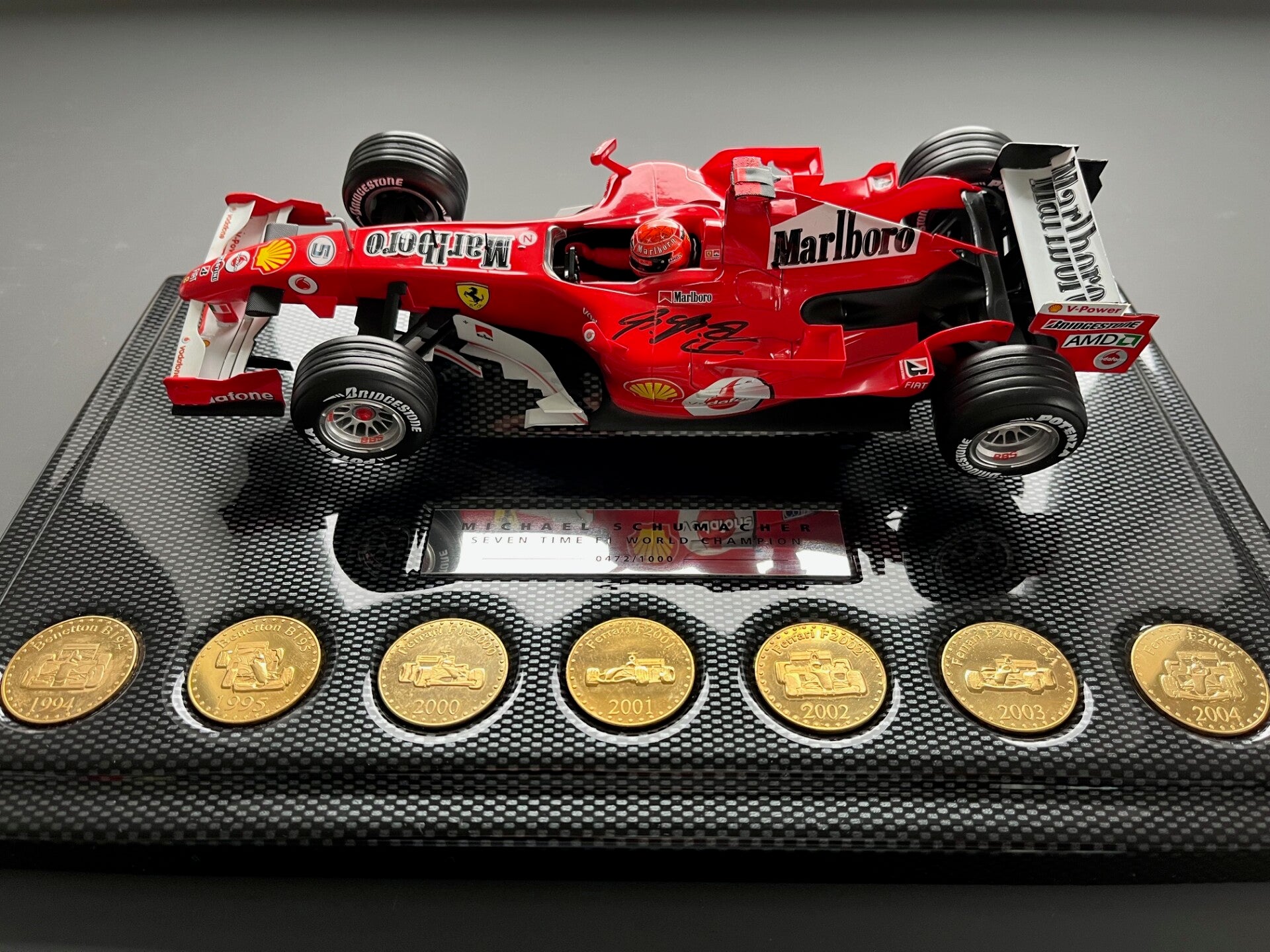 MICHAEL SCHUMACHER SIGNED - FERRARI 248 - 1/18 SCALE - FULL SPONSOR VERSION - 7 X 22 CARAT GOLD COINS - 7 X WORLD CHAMPION - CARBON EFFECT DISPLAY BASE - EXCELLENT